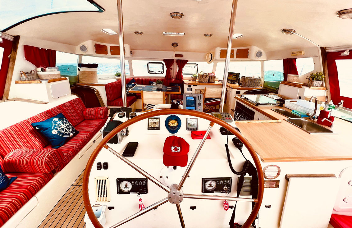 El barco cuenta con dos camarotes con cuatro literas y dos baños, además de un baño con agua caliente. La cocina está equipada con un horno y una estufa, y también hay una nevera a bordo. Los paneles solares proporcionan energía al barco, lo que lo hace respetuoso con el medio ambiente.